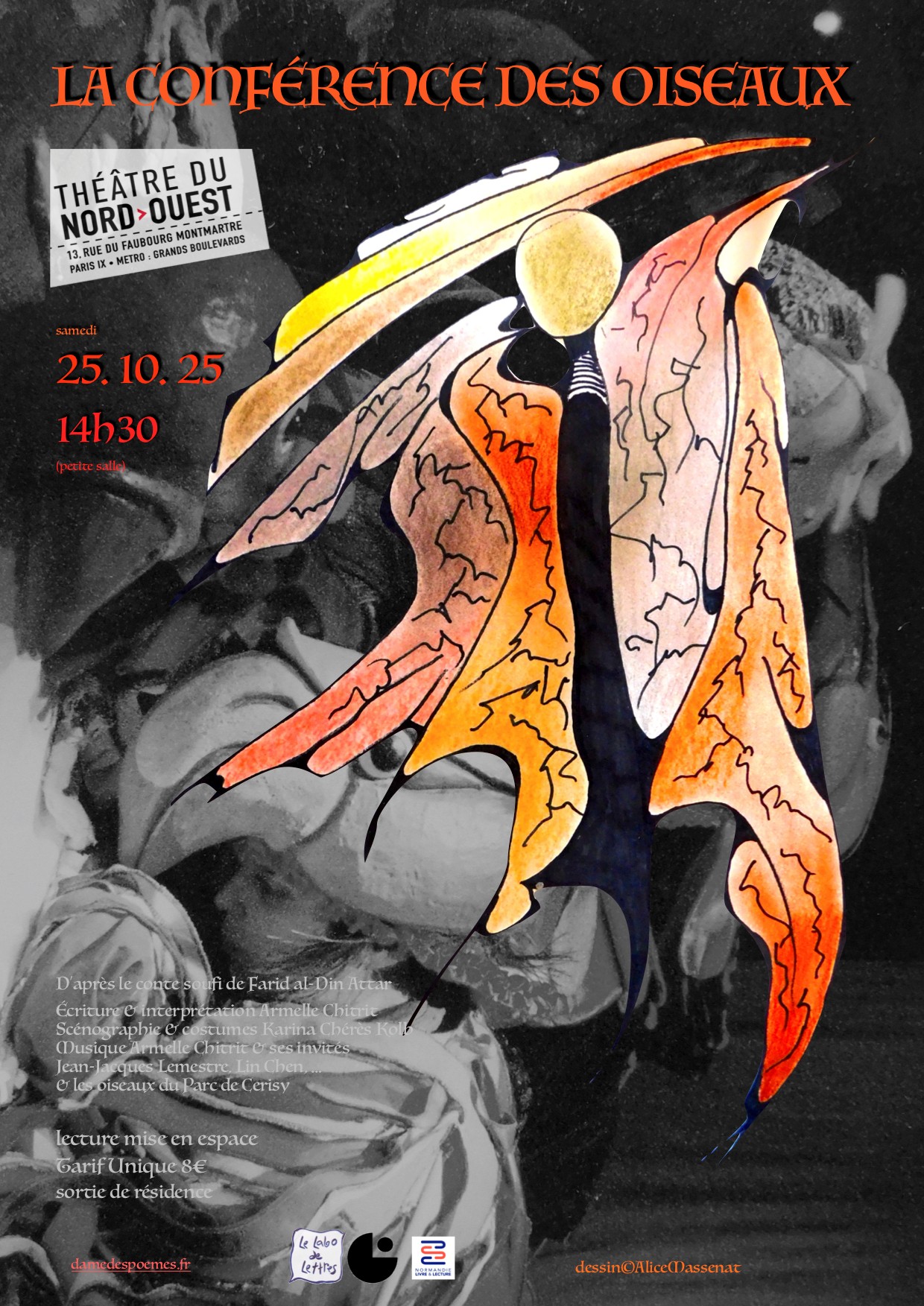 Au théâtre du Nord Ouest, elle invite Jean-Jacques Lemêtre à improviser au gré de cette lecture mise en espace d’un condensé de son écrit. Ce conte en poèmes est librement inspiré par l’auteur perse Attar (XII e s.) mais aussi par d’autres (d’Aristophane à Jean-Claude Carrière, d’Henri Gougaud à Leili Anvar).